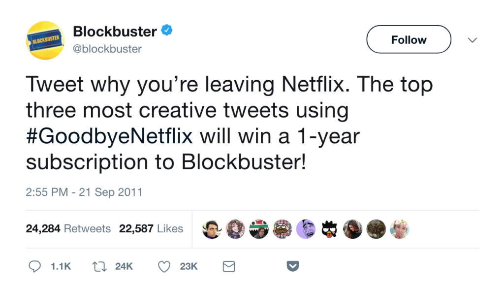 Someone saw the gap between Blockbuster and Netflix and thought “the way to make customers come back is to run a contest.”